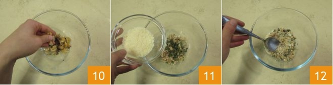 Zerbröseln Sie die Kastanien mit den Händen 10, fügen Sie den gezupften Thymian und den Parmesankäse hinzu 11, gut vermischen 12 und beiseite stellen.