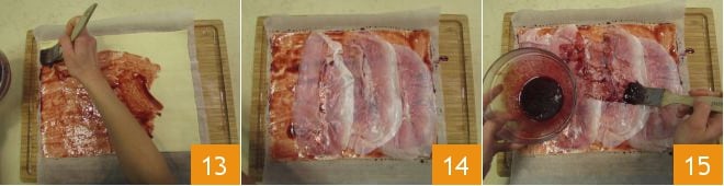 Rollen Sie den Blätterteig aus und bestreichen Sie ihn mit der Granatapfel-Reduktion 13. Legen Sie etwa die Hälfte des Schinkens darauf 14 und bestreichen Sie erneut mit der Reduktion 15.