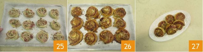 Nun 25 im vorgeheizten statischen Ofen bei 200°C etwa 25-30 Minuten backen, bis sie goldbraun sind. Aus dem Ofen nehmen 26 und Ihre verlockenden herzhaften Blätterteigschnecken mit Granatapfel servieren 27!