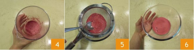 bis eine homogene Mischung entsteht 4, die Sie durch ein Sieb passieren 5, um nur den Saft zu erhalten 6.