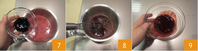Geben Sie den Granatapfelsaft in einen kleinen Topf, fügen Sie die Balsamico-Glasur hinzu 7 und lassen Sie ihn bei geringer Hitze unter häufigem Rühren reduzieren 8. Dann in eine kleine Schüssel umfüllen und abkühlen lassen 9.