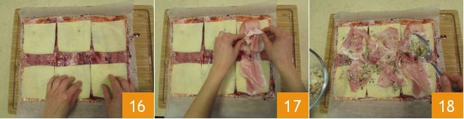 Legen Sie darauf die Käsescheiben 16, den restlichen Schinken 17 und etwa die Hälfte der Kastanien-Parmesan-Mischung 18.