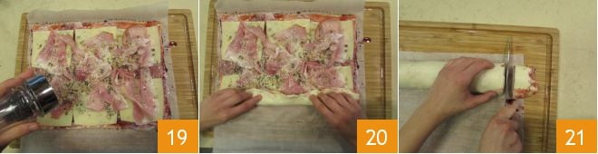 Würzen Sie mit schwarzem Pfeffer 19 und rollen Sie den Teig von der Längsseite her auf 20. Schneiden Sie die Rolle in 12 Schnecken 21.