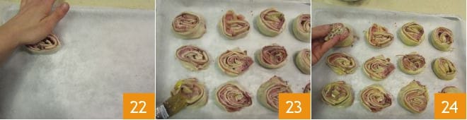 Platzieren Sie die Schnecken auf ein mit Backpapier ausgelegtes Backblech und drücken Sie sie mit den Händen etwas flach 22. Bestreichen Sie die Oberfläche mit dem verquirlten Ei 23 und bestreuen Sie sie mit der Kastanien-Käse-Mischung 24.