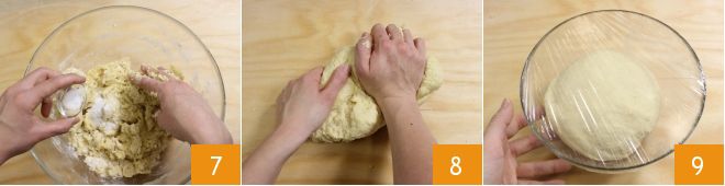 Knetet mit den Händen und fügt das Salz hinzu 7; knetet weiter, bis ihr einen glatten und gleichmäßigen Teig erhaltet 8. Legt den Teig in eine mit Folie abgedeckte Schüssel 9 und lasst ihn etwa 2 Stunden im ausgeschalteten Ofen mit eingeschaltetem Licht gehen.
