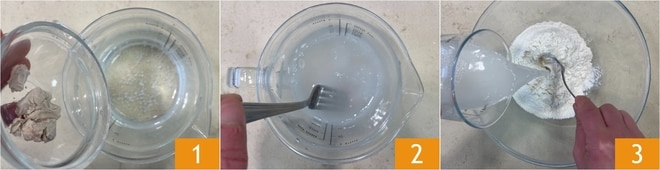 Um die salzigen neapolitanischen Zeppole zuzubereiten, bröseln Sie zuerst die Hefe in das Sprudelwasser 1 und mischen Sie es, bis es sich vollständig aufgelöst hat 2. Gießen Sie die Wasser-Hefe-Mischung in eine Schüssel, in der Sie das Mehl gegeben haben 3.