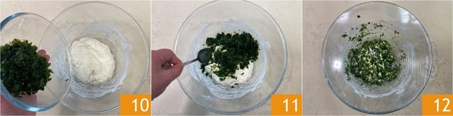 Nach der Gehzeit fügen Sie die gehackten Algen dem Teig hinzu 10 und integrieren Sie sie gleichmäßig 11 12. Decken Sie erneut mit Frischhaltefolie ab und lassen Sie es weitere 30 Minuten ruhen.