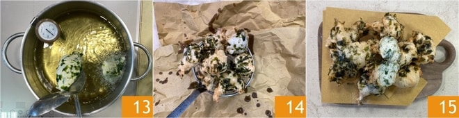 Zu diesem Zeitpunkt erhitzen Sie das Pflanzenöl auf eine Temperatur von 170 °C, entnehmen Sie dann Portionen des Teigs in der Größe einer Nuss und lassen Sie sie mit Hilfe von 2 Löffeln in das heiße Öl gleiten 13. Frittieren Sie wenige Stücke gleichzeitig für 3-4 Minuten, oder bis sie goldbraun sind. Lassen Sie die Zeppole abtropfen und legen Sie sie auf saugfähiges Papier oder Frittierpapier 14. Salzen Sie nach Geschmack und servieren Sie Ihre salzigen neapolitanischen Zeppole sofort 15!