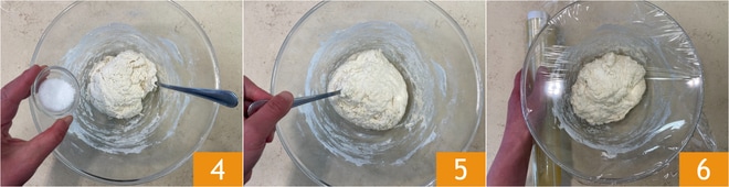 Fügen Sie das Salz hinzu 4 und integrieren Sie es in den Teig 5, dann decken Sie die Schüssel mit Frischhaltefolie ab und lassen Sie den Teig für 30 Minuten aufgehen 6.