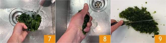 In der Zwischenzeit spülen Sie die Algen gründlich unter fließendem Wasser ab, um das Salz zu entfernen 7, drücken Sie sie dann sorgfältig aus 8 und hacken Sie sie mit einem Messer 9.