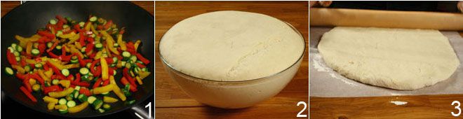 Bereiten Sie den Brotteig vor, indem Sie die Schritte befolgen, die Sie durch Klicken hier finden, und lassen Sie ihn dann bis zur Verdopplung des Volumens aufgehen 2. In der Zwischenzeit waschen und schneiden Sie das Gemüse in kleine Streifen und braten es ein paar Minuten in der Pfanne 1 mit einem Esslöffel Öl an, salzen Sie es und schalten Sie die Hitze aus. Teilen Sie den Teig in zwei Teile, die Sie mit einem Nudelholz zu zwei Rechtecken von etwa einem halben Zentimeter Dicke ausrollen 3.