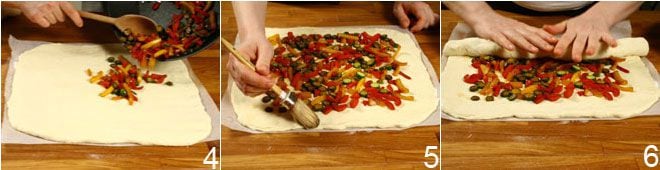 Auf ein Rechteck des Teigs verteilen Sie das Gemüse und lassen Sie dabei ein paar Zentimeter an den Rändern frei 4, die Sie mit etwas Wasser bestreichen 5. Rollen Sie den gefüllten Teig auf und formen Sie eine Rolle 6, die Sie versiegeln 7 und lassen Sie sie mit der Naht nach unten aufgehen.