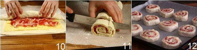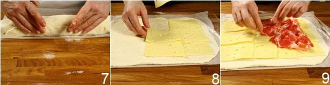 Nehmen Sie das zweite Rechteck des Teigs, füllen Sie es mit Käsescheiben 8 und Speck 9, und rollen Sie es 10 auf, indem Sie die Ränder mit Wasser bestreichen, um es zu versiegeln.