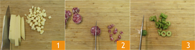 Um den salzigen 7-Tassen-Kuchen vorzubereiten, schneiden Sie zuerst den Käse 1, die Salami in 1 cm große Würfel 2 und die Oliven in Ringe 3.