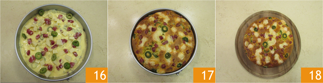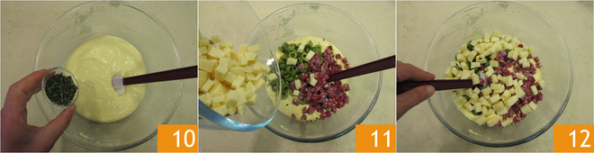 Aromatisieren Sie mit dem gehackten Majoran 10, fügen Sie die Salami, den Käse 11 und die Oliven hinzu. Ein wenig Füllung zur Seite legen für die Oberfläche. Alles vermengen 12 um es gut zu vermischen.