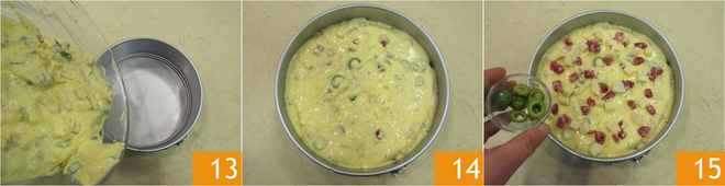 Gießen Sie den Teig in eine eingefettete 20 cm Springform 13. Gut glattstreichen 14 und die Oberfläche mit der beiseitegelegten Füllung garnieren 15.