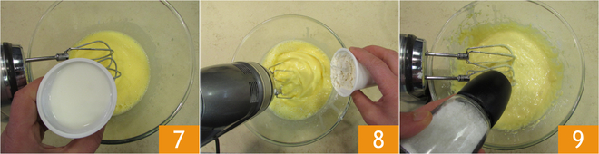 Schlagen Sie die Eier in einer Schüssel mit einem elektrischen Mixer 4, geben Sie das Joghurt hinzu, während der Mixer weiterläuft 5. Fügen Sie das Öl hinzu 6.