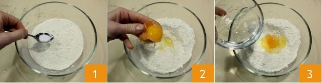 Um den salzigen Strudel mit Schinken, Pilzen und Fontina zuzubereiten, beginnen Sie mit dem Teig: Geben Sie das gesiebte Mehl in eine Schüssel, fügen Sie das Salz hinzu 1 und dann das Ei 2. Gießen Sie dann auch das Wasser dazu 3.