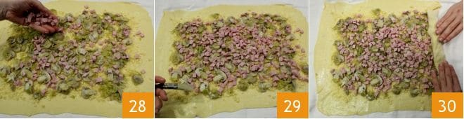 Verteilen Sie zuletzt die Würfel von Kochschinken 28. Bestreichen Sie die Ränder mit Eiweiß 29 oder Wasser. Dann beginnen Sie, den Strudel mit Hilfe des Tuchs aufzurollen 30, beginnend mit der kürzeren Seite und die Naht nach unten lassen.