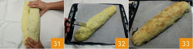 Vollenden Sie das Aufrollen des Strudels auf sich selbst 31 und klappen Sie die beiden Enden des Teigs unter den Strudel. Legen Sie den Strudel auf ein mit Backpapier ausgelegtes Backblech und bestreichen Sie die Oberfläche des Strudels mit etwas Olivenöl Extra Vergine 32; backen Sie im vorgeheizten statischen Ofen bei 180° für 40 Minuten (bei Umluftofen 160° für 30-35 Minuten). Sobald er gebacken ist, nehmen Sie ihn aus dem Ofen 33 und lassen Sie ihn auf einem Gitterrost abkühlen, dann schneiden und servieren Sie ihn!