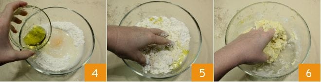 Fügen Sie auch das Öl hinzu 4 und beginnen Sie dann zu kneten 5; arbeiten Sie die Mischung in der Schüssel, bis die Flüssigkeiten absorbiert sind und der Teig Form angenommen hat 6.