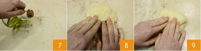 Befeuchten Sie nun die Arbeitsfläche 7 oder das Nudelbrett leicht mit Öl und übertragen Sie den Teig darauf. Bearbeiten Sie ihn 8, bis er glatt und elastisch ist 9.