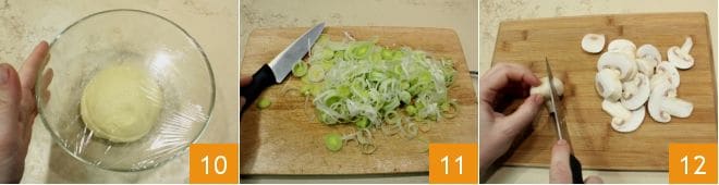 Formen Sie eine Kugel aus dem Teig, legen Sie sie in eine Schüssel und bedecken Sie sie mit Frischhaltefolie 10. Lassen Sie den Teig an einem kühlen Ort mindestens 30 Minuten ruhen. Bereiten Sie in der Zwischenzeit die Füllung vor: Putzen Sie den Lauch, indem Sie den Bart und den grünen Teil entfernen, dann ziehen Sie die äußerste Schicht ab und schneiden Sie ihn fein 11. Dann reinigen Sie die Champignons (für diese Operation können Sie das Blatt zum Reinigen der Champignons konsultieren): Waschen Sie sie unter fließendem Wasser, trocknen Sie sie dann mit einem Tuch oder Küchenpapier, um eventuelle Erde zu entfernen, und schneiden Sie die Köpfe fein 12.