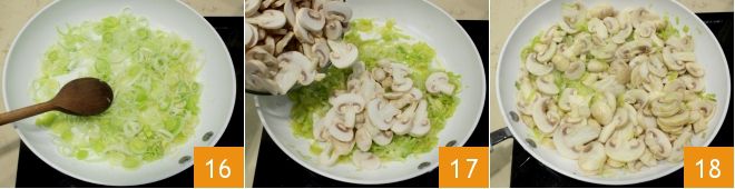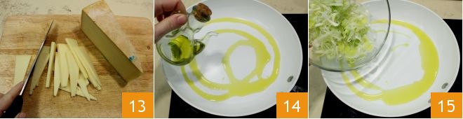 Schneiden Sie auch den Fontina in Scheiben 13 und entfernen Sie die Rinde. Geben Sie dann ein wenig Öl in eine große Pfanne und fügen Sie den vorher geschnittenen Lauch hinzu 15.