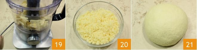 Während die Pilze kochen, geben Sie den Fontina in Stücken in den Mixer und pürieren Sie ihn, dann sammeln Sie ihn in einer Schüssel 20. Jetzt, da Sie die Zutaten für die Füllung bereit haben, nehmen Sie den Strudelteig zurück, um ihn auszurollen 21