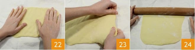 Nehmen Sie ein sauberes Tuch und legen Sie es auf die Arbeitsfläche: Bestäuben Sie es mit Mehl und beginnen Sie, den Teig auszurollen 22; dehnen Sie ihn leicht mit den Fingern 23 und beginnen Sie dann, ihn mit einem Nudelholz 24 auszurollen, wobei Sie auch die obere Seite des Teigs bemehlen.