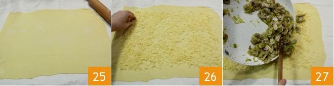 Arbeiten Sie mit dem Nudelholz, bis Sie ein Rechteck von 50x35 cm 25 erhalten haben. Bestreuen Sie es mit den Zutaten der Füllung und lassen Sie etwa 3 cm vom Rand frei: Fügen Sie zuerst den zerkleinerten Fontina 26 hinzu, dann die Lauch-Pilz-Mischung 27.