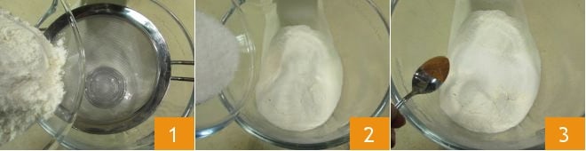 Um die Sankt-Martins-Kekse zuzubereiten, sieben Sie das Mehl in die Schüssel einer Küchenmaschine mit Knethaken 1, fügen Sie auch den Zucker hinzu 2, aromatisieren Sie mit gemahlenem Zimt 3