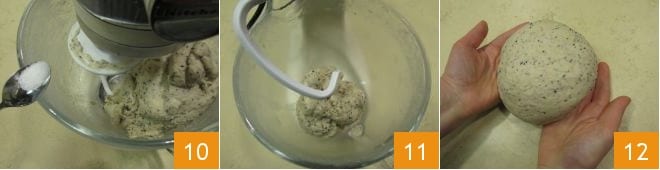 Zum Schluss fügen Sie auch das Salz hinzu 10 und kneten Sie weiter, bis Sie einen glatten und homogenen Teig erhalten, der sich von den Wänden löst und am Haken haftet 11. Nehmen Sie den Teig und kneten Sie ihn kurz auf einer Arbeitsfläche, um ihm eine runde Form zu geben 12