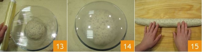 Übertragen Sie den Teig in eine Schüssel, decken Sie ihn mit Frischhaltefolie ab 13 und lassen Sie ihn im ausgeschalteten Ofen mit eingeschaltetem Licht für 3,5 Stunden oder bis er sein Volumen verdreifacht hat, aufgehen. Sobald er aufgegangen ist 14, nehmen Sie den Teig und legen Sie ihn auf eine Arbeitsfläche. Formen Sie einen Laib 15
