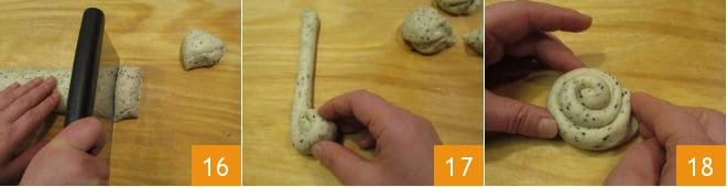 Schneiden Sie daraus Stücke von etwa 60 g 16 und formen Sie mit jedem Stück 26 cm lange Stangen, rollen Sie die Stange auf, um eine Spiralenform zu erstellen (17-18).
