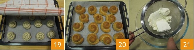 Legen Sie die kleinen Kekse auf ein mit Backpapier belegtes Backblech, decken Sie sie mit einem Tuch ab 19 und lassen Sie sie 30 Minuten bei Raumtemperatur gehen. Beenden Sie die zweite Gehzeit, backen Sie die Sankt-Martins-Kekse bei 180° für 30 Minuten. Die Kekse sollten gut goldbraun sein 20. Während die Kekse abkühlen, bereiten Sie die Creme vor: In einer Schüssel die Ricotta sieben 21,