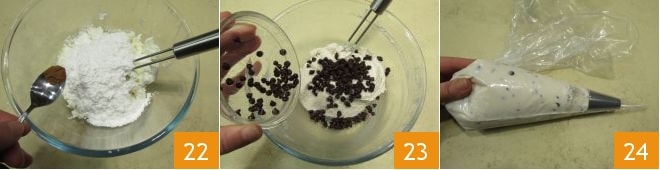 fügen Sie den Puderzucker, den Zimt 22 und die Schokoladentropfen 23 hinzu. Mischen Sie, um die Zutaten zu kombinieren, und geben Sie die Creme in einen Spritzbeutel mit glatter Düse 24 und stellen Sie sie im Kühlschrank fest.