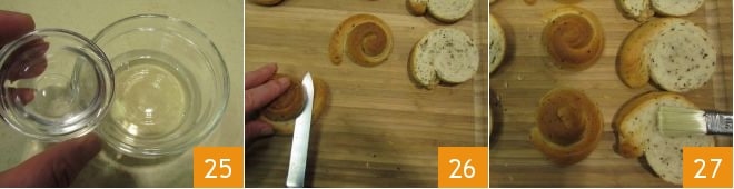 In einer kleinen Schüssel den Muskateller mit Wasser verdünnen 25, dann die gut abgekühlten Kekse nehmen, sie halbieren 26 und die Innenseite mit dem Muskateller-Guss bestreichen 27.