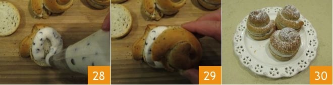 Spritzen Sie die Creme auf eine der beiden Hälften der Kekse 28 und schließen Sie mit der oberen Hälfte 29. Die Sankt-Martins-Kekse sind servierfertig 30.