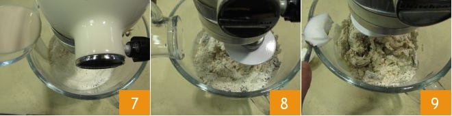 Schalten Sie die Küchenmaschine auf niedrige Geschwindigkeit und gießen Sie langsam das Wasser hinzu, in dem Sie die Hefe aufgelöst haben 7, fügen Sie ebenfalls langsam die restliche Wassermenge hinzu 8. Geben Sie auch das Schmalz, einen Esslöffel nach dem anderen, hinzu 9.