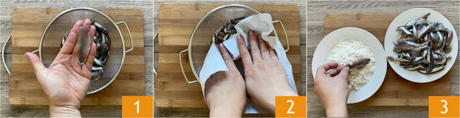 Um die Sardellen alla scapece vorzubereiten, spülen Sie zuerst die bereits gereinigten Sardellen ab, lassen Sie sie abtropfen 1 und tupfen Sie sie mit Küchenpapier ab 2. Anschließend mehlieren Sie sie 3.