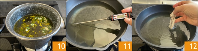 Erhitzen Sie die Marinade auf dem Herd, ohne sie zum Kochen zu bringen, für 10 Minuten bei niedriger Flamme 10. Dann gehen Sie zum Frittieren über: erhitzen Sie das Erdnussöl in einer Pfanne auf eine Temperatur von 170°C 11 und frittieren Sie wenige Sardellen gleichzeitig für etwa 2 Minuten 12.