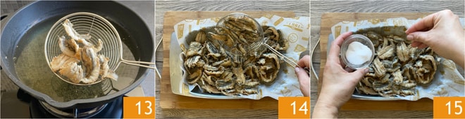 Lassen Sie die Sardellen 13 auf Küchenpapier oder einem saugfähigen Papier abtropfen 14 und salzen Sie sie leicht 15.