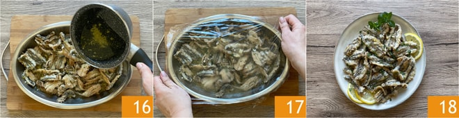 Gießen Sie die Marinade über die Sardellen 16. Decken Sie die Sardellen alla scapece mit Frischhaltefolie ab 17 und stellen Sie sie vor dem Servieren für eine Nacht in den Kühlschrank 18.