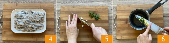 Entfernen Sie das überschüssige Mehl und stellen Sie es beiseite 4. Hacken Sie die Knoblauchzehen und die frische Minze 5. Geben Sie die gehackten Aromen in ein Töpfchen 6