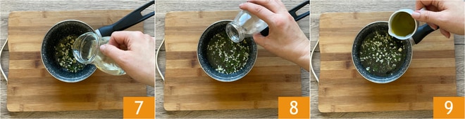 Fügen Sie auch den Essig 7, das Wasser 8 und das extra native Olivenöl 9 hinzu.