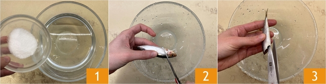 Geben Sie in eine Schüssel das Wasser mit dem Salz 4 und rühren Sie, um es aufzulösen. Lassen Sie die Sardinen etwa 20 Minuten einweichen: Die Salzlösung hilft, sie besser vom Blut zu reinigen und verleiht der Zubereitung mehr Würze 5. Nach dem Einweichen die Sardinen auf Küchenpapier abtropfen lassen und trocknen 6.