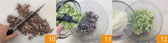 Hack Sie die Sardinen mit einem Messer 10 und geben Sie sie in eine große Schüssel, fügen Sie dann die Brotwürfel mit der Petersilie 11 und den geriebenen Ragusano DOP hinzu 12.