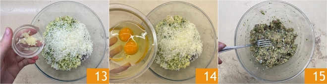Fügen Sie auch den gehackten Knoblauch 13, die Eier 14 und den Pfeffer hinzu, dann kneten Sie alles, um es zu verbinden 15. Lassen Sie die Masse 30 Minuten im Kühlschrank ruhen.
