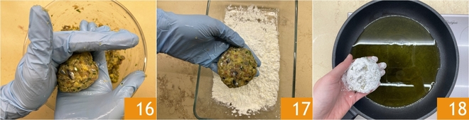 Ölen Sie Ihre Hände, nehmen Sie jeweils einen Löffel der Masse und formen Sie leicht flachgedrückte Bällchen 16, dann bestäuben Sie sie mit Maisstärke 17. Erhitzen Sie eine großzügige Menge Öl in einer Pfanne und tauchen Sie die Bällchen hinein 18.
